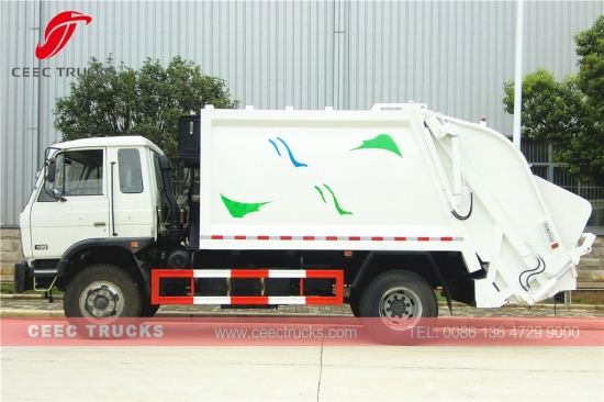 東風10,000Lゴミ圧縮トラック、CUMMINSブランドのディーゼルエンジンを使用、エンジン出力170HP、EURO 3排出ガス基準、操作が簡単な手動6シフトギアボックス、内側と外側の防錆塗装が施された強力な品質のスチール素材の圧縮機本体、必要なすべてのロゴ