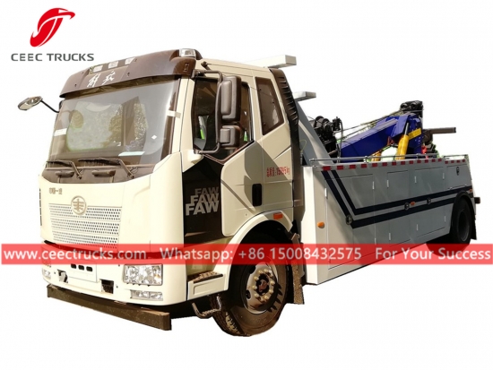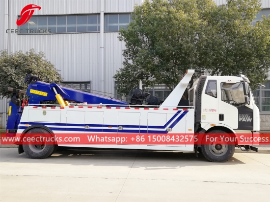 トップクラスの 12 トン FAW ロードレッカー トラック、4x2 LHD/RHD シャーシ、手動 8 シフト ギアボックス、FAW エンジン 224HP ディーゼル エンジン、油圧シリンダー作動のリフティング ブーム、塗装およびロゴは要件によって異なります。