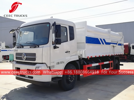 東風15000リットルゴミ収集車。東風LHD/RHD 4x2シャーシ、カミンズ製210馬力ディーゼルエンジン、8段マニュアルギアボックス、操作しやすい油圧式リアドアを採用。塗装とロゴはご要望に応じて変更いたします。