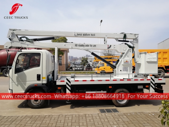 16m バケット クレーン リフティング トラック、HOWO ブランド モデル 4x2 シャーシ、5 シフト マニュアル ギアボックス、100HP ディーゼル エンジン、塗装およびロゴは要件に応じて異なります、顧客言語コントロール ボックス。