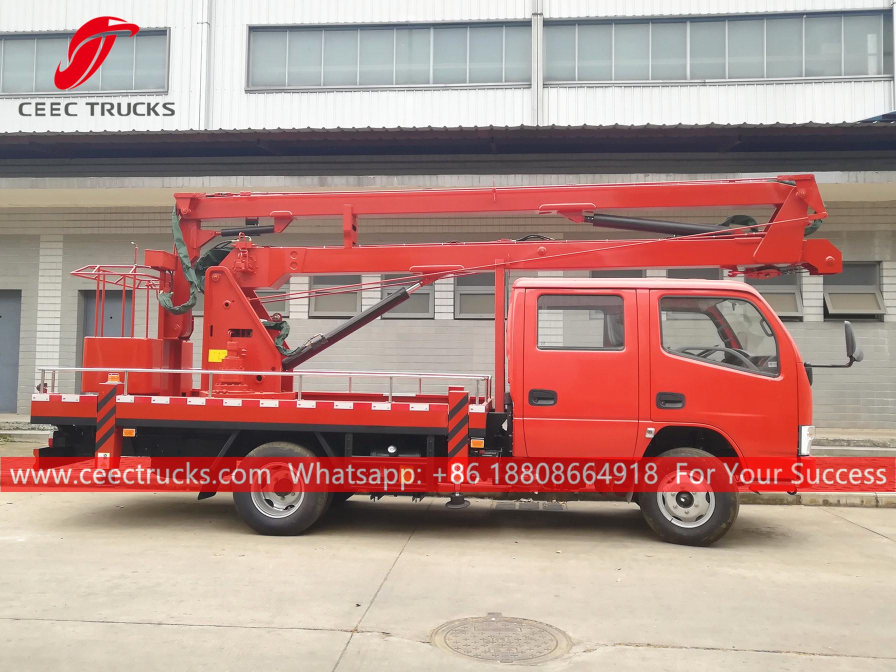 16mのマンリフトトラック、東風ブランド4x2シャーシ、5速マニュアルギアボックス、102馬力ディーゼルエンジン。塗装とロゴはご要望に応じて変更します。お客様対応の言語コントロールボックス。