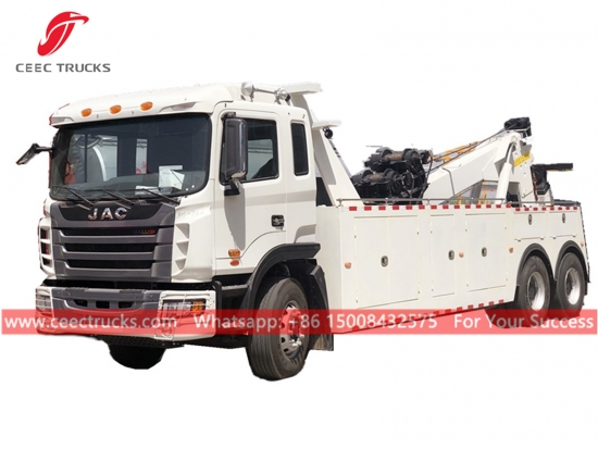 シエラレオネ向け最高の JAC 16 トン ロード レッカー トラック輸出、JAC クラシック 6x4 LHD シャーシ、マニュアル 9 シフト ギアボックス、YUCHAI 336HP ディーゼル エンジン、油圧シリンダー作動のリフティング ブーム、塗装およびロゴは要件によって異なります。