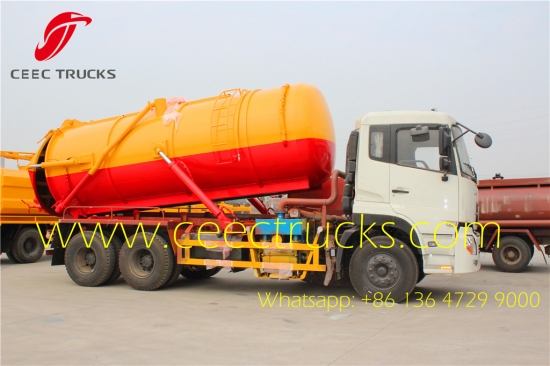 東風6*4 LHDシャーシ、240HPの超強力なエンジン、8シフトマニュアルギアボックス、厚さ5mmを超える高強度炭素鋼素材のタンカーを使用した、18m³の汚水溜めタンクのホットセールモデル。塗装とロゴは必要に応じて変更可能です。