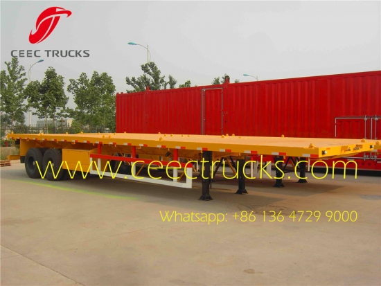 2軸40フィートフラットベッドトレーラー/プラットフォームコンテナ輸送セミトレーラー、ボギー付き、重量型ボギーサスペンショントレーラーはBPW車軸とJOSTキングピンと着陸脚を使用し、主にケニア、コンゴ、タンザニアなどに輸出