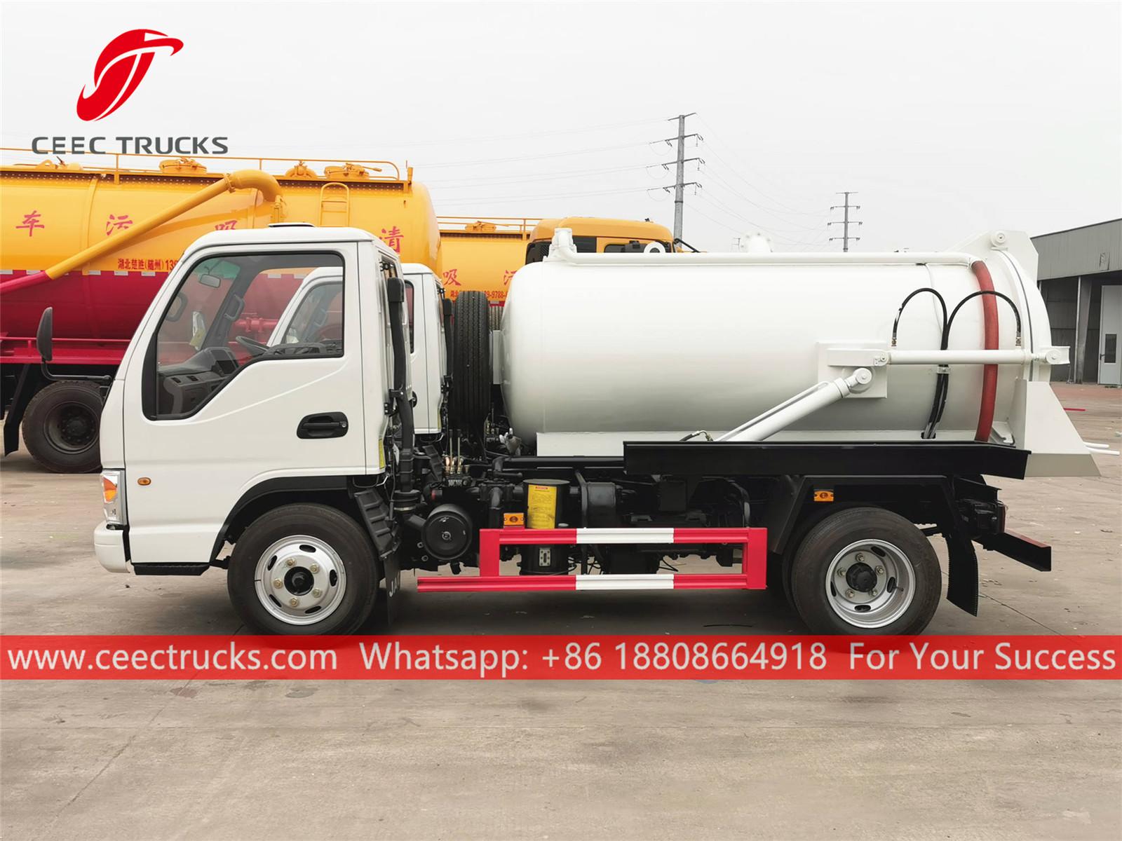 JAC 3cbm 真空タンカー トラック、左ハンドル モデル 4x2 シャーシ、5 シフト マニュアル ギアボックス、WEICHAI 130HP ディーゼル エンジン、塗装およびロゴは要件に応じて異なります。
