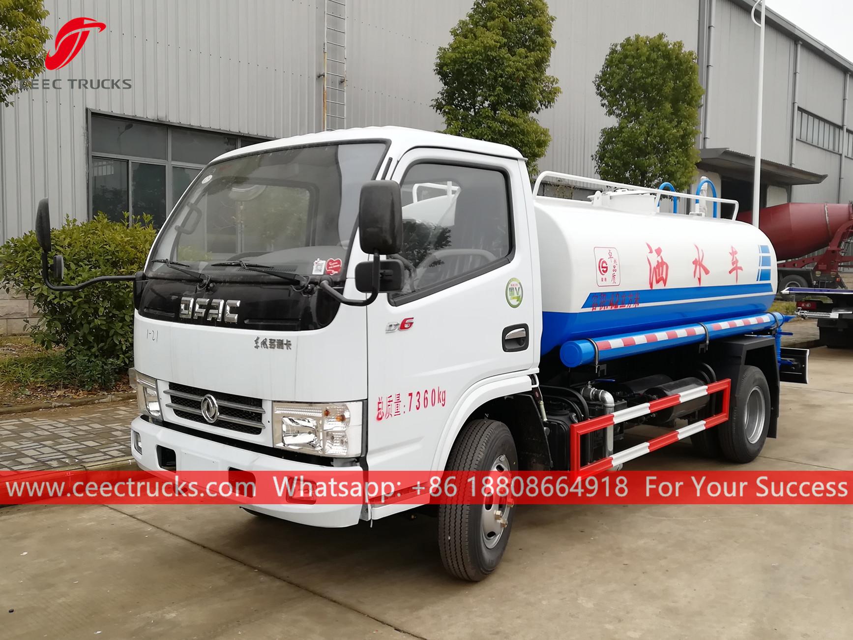 DONGFENG 4,000L 水輸送トラック、DONGFENG 4x2 左ハンドル シャーシ、5 シフト マニュアル ギアボックス、CHAOCHAI 130HP ディーゼル エンジン、有名ブランドのウォーター ポンプ、オプションでフロント、ミドル、リアのスプレー ノズル付き、すべての塗装とロゴは要件によって異なります。