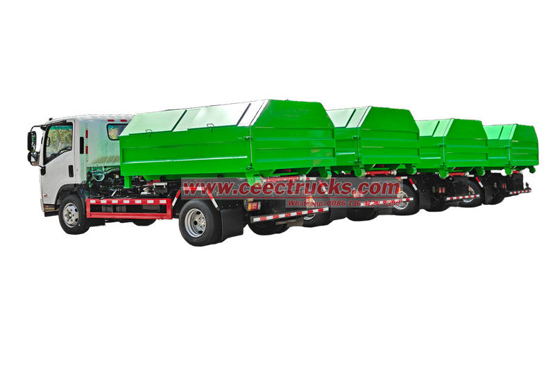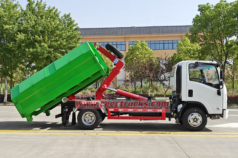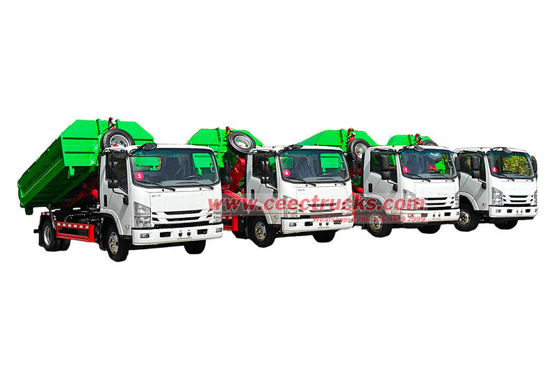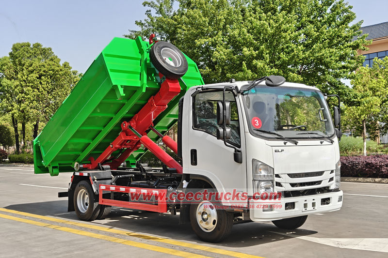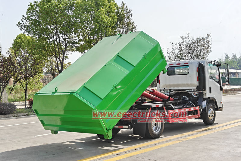 Isuzu NPR フックリフトゴミ収集車は、完全な油圧制御システムによりゴミ箱の迅速な積み込み、積み下ろし、投棄を実現します。