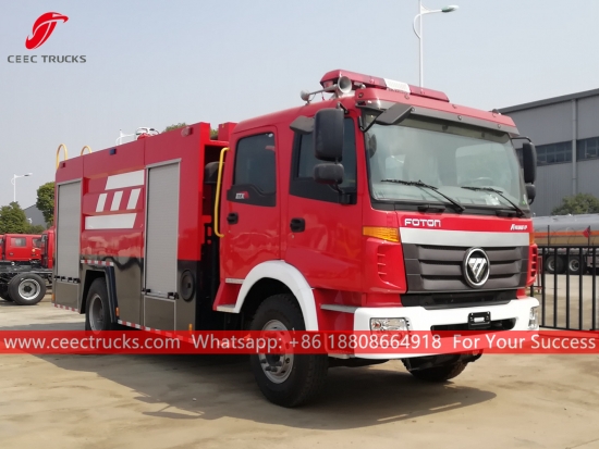 FOTON 5CBM 水タンカー消防車、FOTON 左ハンドルモデル 4x2 シャーシ、7 シフトマニュアルギアボックス、CUMMINS 210HP ディーゼルエンジン、水タンカー容量 5000 リットルを使用、塗装およびロゴは要件によって異なります。