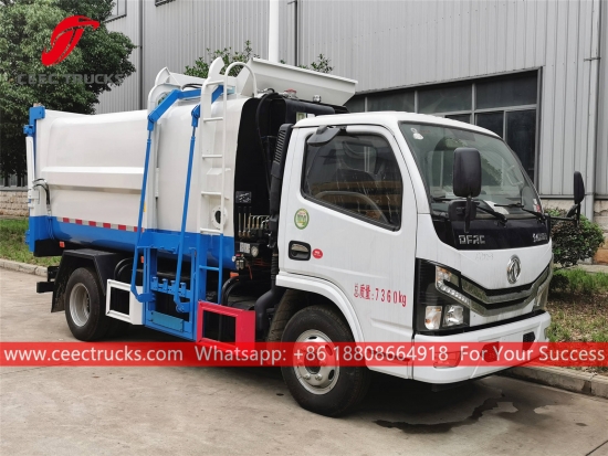 DONGFENG 5cbm 厨房廃棄物積載トラック、DONGFENG 4x2 シャーシ、5 シフトマニュアルギアボックス、CHAOCHAI 130HP ディーゼルエンジン、自動サイドリフティング装置、油圧式後部ドアを装備、塗装およびロゴは要件によって異なります。
