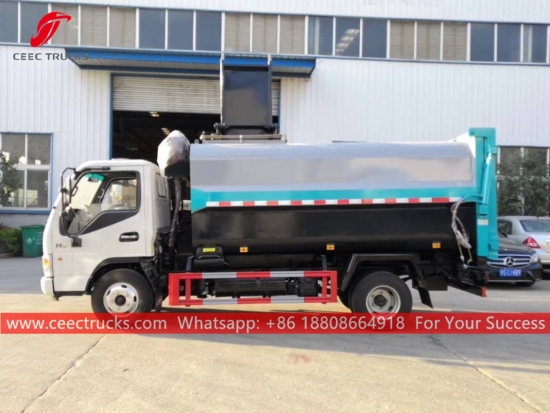 JAC 5cbm 厨房廃棄物収集トラック、JAC 4x2 シャーシ、5 シフトマニュアルギアボックス、CUMMINS 130HP ディーゼルエンジン、自動サイドリフティング装置、油圧式後部ドアを装備、塗装およびロゴは要件によって異なります。