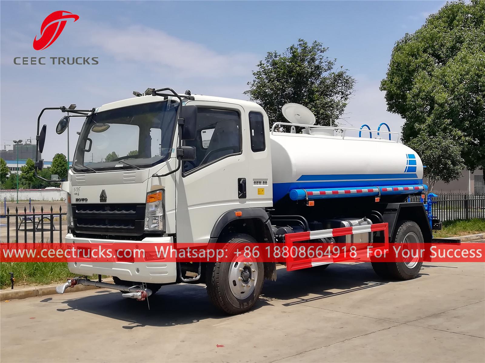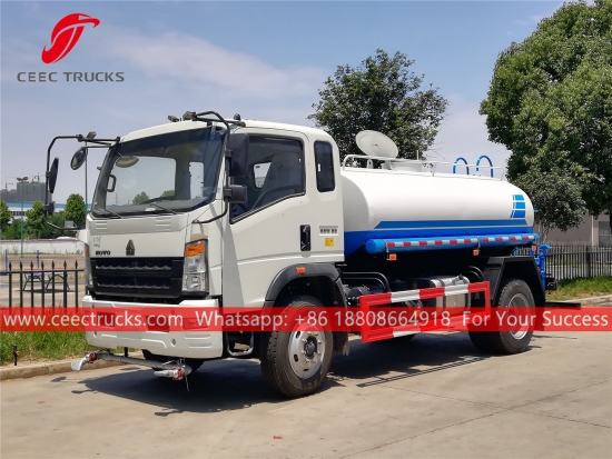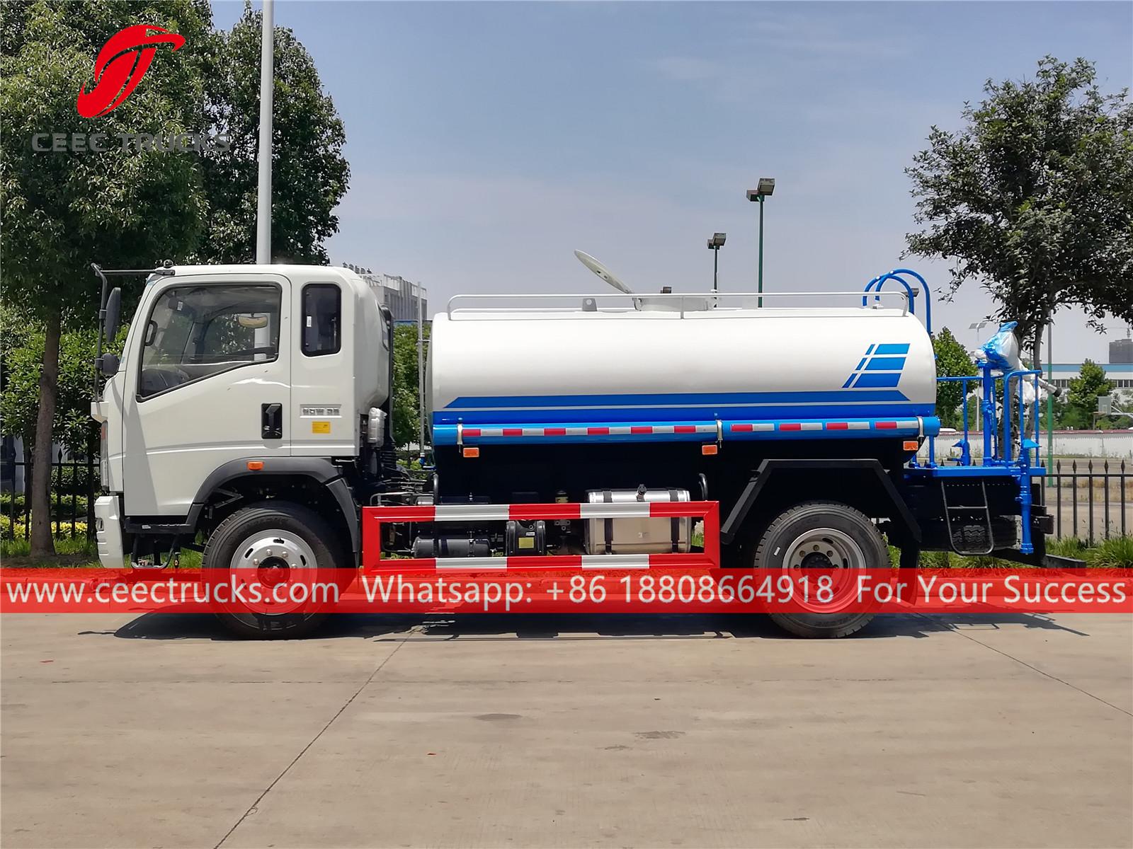 HOWO 8,000L散水トラック、HOWO 4x2左ハンドルシャーシ、6速マニュアルギアボックス、SINOTRUK 160馬力ディーゼルエンジン、有名ブランドのウォーターポンプ、オプションでフロント、ミドル、リア散水ノズルを装備。塗装とロゴはご要望に応じて変更いたします。