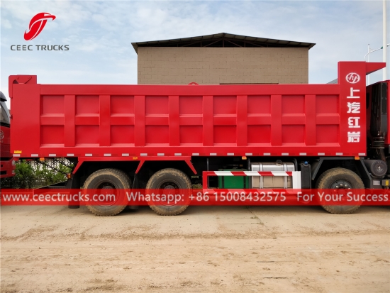 60トンダンプトラック、IVECO製8x4 LHDシャーシ、FAST製12段マニュアルギアボックス、有名中国ブランドCursor製390馬力ディーゼルエンジン、高強度鋼製ダンプボディ、HYVA製または国産油圧リフター(オプション)搭載。塗装およびロゴはご要望に応じて変更いたします。