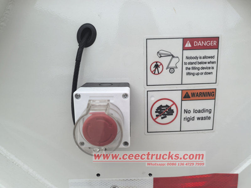 ● 緊急停止ボタンが設置されており、どのような状況や場所でもゴミ圧縮装置を即時に停止することができ、作業者と機器の両方を守ります。