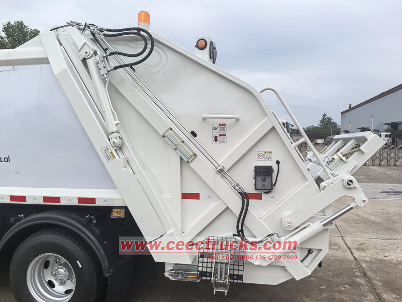オペレーターと設備の安全を確保するため、車両には複数の安全保護機構が備えられています。緊急停止ボタンが設けられており、ゴミ圧縮装置をあらゆる状態・位置で即座に停止させ、事故を未然に防ぎます。さらに、昇降シリンダーには防爆弁が装備されており、油管の突然の破裂時に充填機の下降を防止し、危険を回避します。