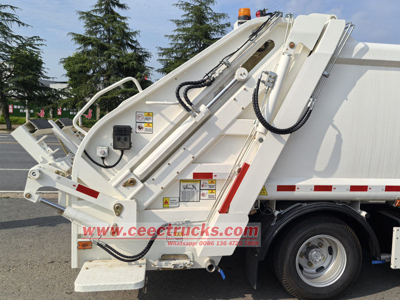 ● ゴミを降ろす際は、昇降シリンダーがガイド穴に沿ってローダー後部ドアを持ち上げ、ロックを解除します。同時に、プッシュプレートが後方に移動してゴミを押し出します。このプロセス全体は、電子制御システムのボタン一つで操作できるため、効率性と安全性が確保されています。