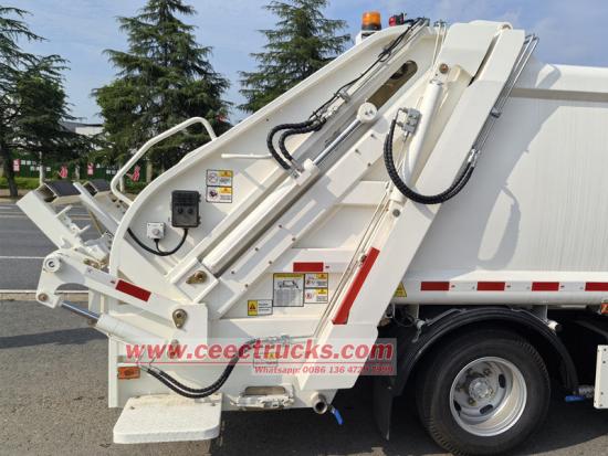 Isuzu 油圧式圧縮ローダー トラックには、強力な圧縮機能があり、効率的にゴミを圧縮し、積載量を増やして輸送頻度を減らすことができます。3360mm のホイール ベース、4JB1CN 98hp エンジン、ユーロ 4 ディーゼル 2.771L 排出量、Isuzu MSB 5 シフト ギアボックス、合計 7 個の 700R16 タイヤ、エアコン、USB、方向指示器、3 つの座席を備えています。上部には 6cbm のゴミ箱があり、後部にはバケット フリップ メカニズムがあり、トラックの積み下ろしには 3 つの操作方法があります。