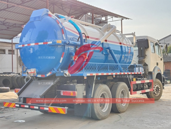 コンゴ向け輸出用Beiben 6×4 20000L真空吸引トラック。WEICHAI製380馬力ディーゼルエンジン、FAST製12段マニュアルギアボックス、高強度炭素鋼製タンカーを搭載。容量は16000~20000リットル。中国製WEILONG真空ポンプと輸入JUROP / BP / MORO真空ポンプ(オプション)、廃棄物排出用油圧リフト装置、塗装およびロゴはご要望に応じて変更いたします。