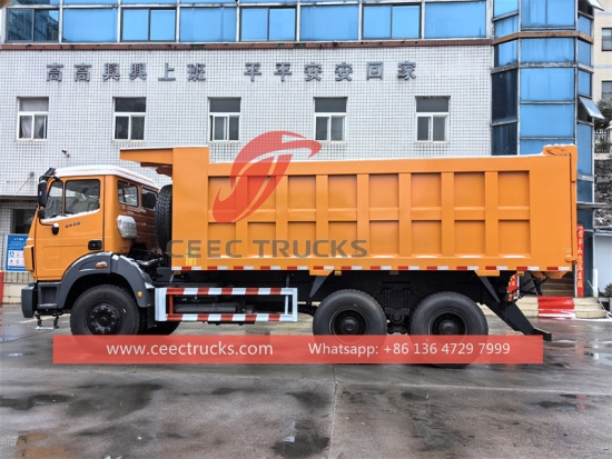 Beiben 20トンダンプトラック、Beiben 6x4シャーシ、FAST 9段マニュアルギアボックス、Beiben 380馬力ディーゼルエンジン、高強度鋼製ダンプボディ、HYVAまたは国産油圧リフター(オプション)を装備。塗装とロゴはご要望に応じて変更いたします。