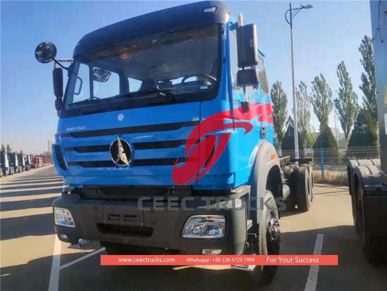 ベイベン2642 トラック シャーシ、オフロード システムを備えた 6*6 ドライブ、有名ブランドの Weichai 420 hp ディーゼル エンジン、非常に信頼性の高い 12JS200T トランスミッション、4450+1450 mm ホイール ベース、頑丈な強化 4 U ボルト サスペンション システム、メルセデス ベンツ テクノロジーのフロント アクスルとリア アクスル、ベンツ テクノロジーの NG80B キャビン。