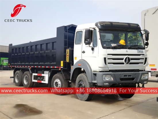 ベイベン 40トンダンプトラック、Beiben 8x4シャーシ、FAST 12段マニュアルギアボックス、有名中国ブランドWEICHAI 340馬力ディーゼルエンジン、高強度鋼製ダンプボディ、HYVAまたは国産油圧リフター(オプション)搭載。塗装とロゴはご要望に応じて変更いたします。