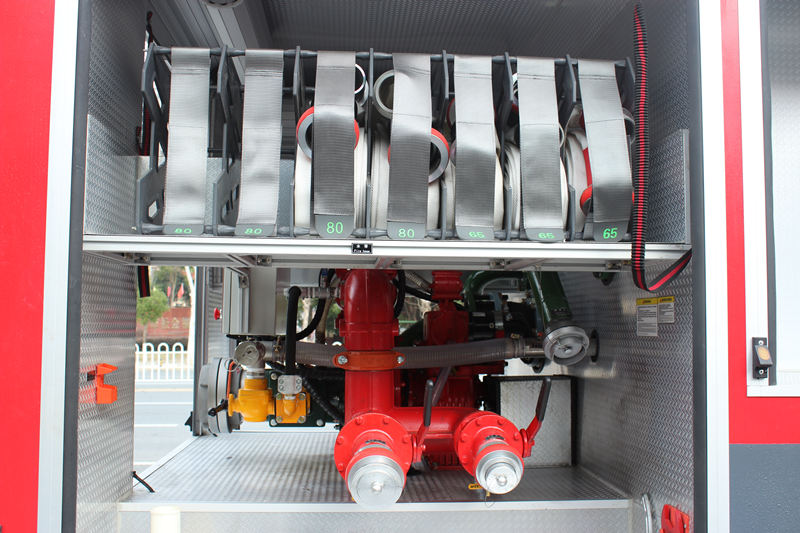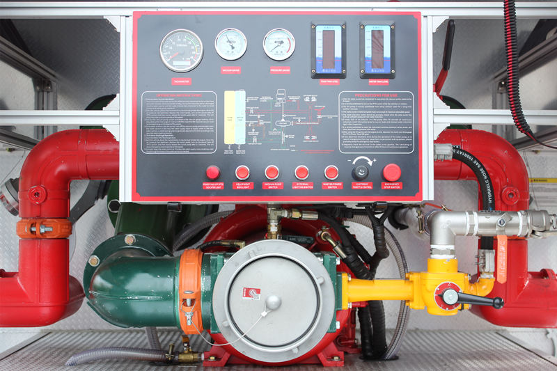 â–² 消防ポンプシステム:この車両には高性能CB10/60消防ポンプが搭載されています定格流量は最大60L/s、最大作動圧力は1.232MPaで、長距離・大流量の給水ニーズに対応します。この送水ポンプは二段遠心設計を採用し、強力な自吸力と安定した運転性能を備えています。7メートルの吸込深度でも、安定した水圧を迅速に確立できます。