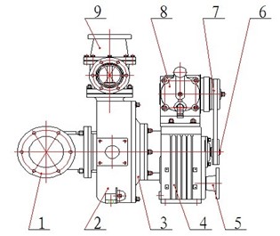1 入口三方弁 2 シェル 3 リアカバー 4 ギアボックス 5 シャフトカップリングフランジ 6 ベルトホイール 7 電磁クラッチ 8 ピストンプライマーポンプ 9 背圧弁