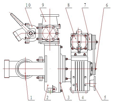 1 入口三方弁 2 シェル 3 リアカバー 4 ギアボックス 5 シャフトカップリングフランジ 6 ベルトホイール 7 電磁クラッチ 8 ピストンプライマーポンプ 9 背圧弁 10 出口ボールバルブ