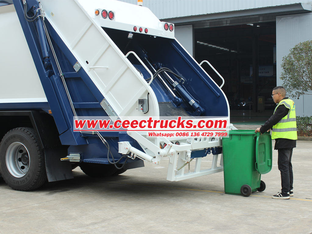 バケット吊り下げ機構は、ISUZUのゴミ圧縮車に搭載されている一般的なゴミ箱昇降機構の一つです。120L、240L、300L、660Lなど、様々なサイズのゴミ箱を反転フレームで固定し、反転動作でゴミを自動的に排出します。この機構は操作が簡単で幅広い用途に対応できるため、街路や住宅街などの都市部のゴミ集積所に最適です。バケット吊り下げ機構を備えたISUZUのゴミ圧縮車は、通常、油圧制御システムを搭載しており、スムーズで確実な反転動作を実現します。
