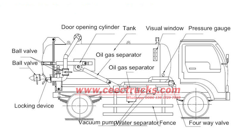 上部には、強力な吸引力を持つ輸入真空ポンプ(カスタマイズ可能なブランド)が装備されており、廃水、スラリー、沈殿物の迅速な抽出・移送が可能です。油圧システムにより、タンクを持ち上げ、背面カバーを開けることができるため、荷降ろし時の時間と労力を節約し、作業効率を大幅に向上させます。