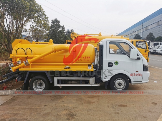 東風2000Lミニ真空タンクローリー(アフリカ向け輸出)は、QUANCHAI 95馬力ディーゼルエンジン、5速マニュアルギアボックス、高強度炭素鋼材を採用。積載量は1~3立方メートル。オプションで国産WEILONG製真空ポンプ、輸入JUROP / BP / MORO製真空ポンプ、廃棄物排出用油圧式リフト装置を装備可能。塗装およびロゴはご要望に応じて変更いたします。