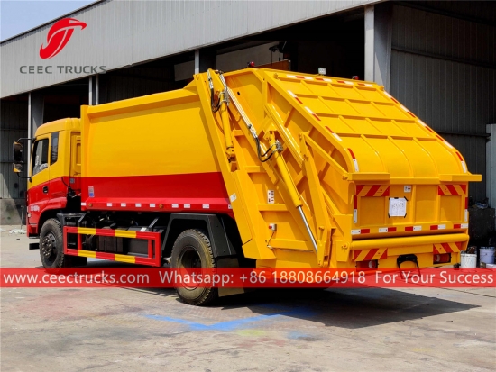 東風12cbmゴミ圧縮車。シャーシにはカミンズ製180馬力ディーゼルエンジンと6速マニュアルトランスミッションを搭載。PLC制御ボックスで操作も簡単。塗装とロゴはすべてお客様のご要望に応じて変更いたします。