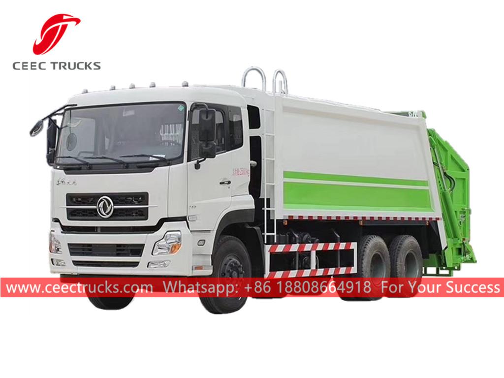 東風 20,000 リットルゴミ圧縮トラック、東風 6x4 シャーシ、CUMMINS 245 HP ディーゼルエンジン、運転しやすい FAST 9 シフトマニュアルギアボックス。PLC制御ボックス。すべてのペイントとロゴは要件に応じて異なります。