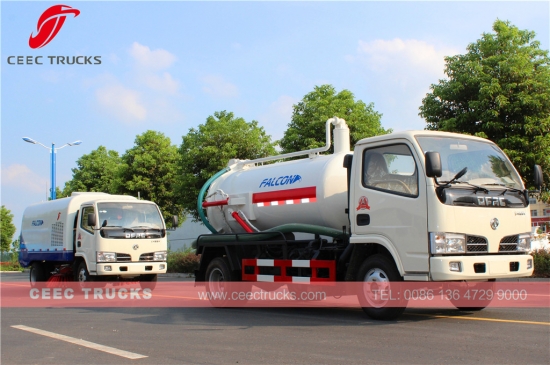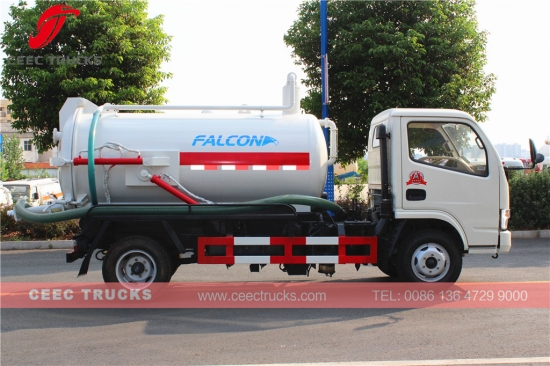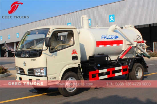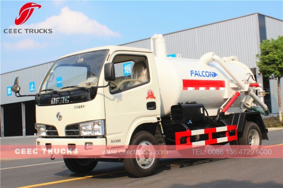 Dongfeng 4000L 真空汚水吸引トラックは、CHAOCHAI 95HP ディーゼルエンジン、5 シフトマニュアルギアボックス、最大 4cbm の高強度鋼材タンカーを搭載し、WEILONG 真空ポンプが標準装備されています。塗装とロゴはリクエストに応じて異なります。