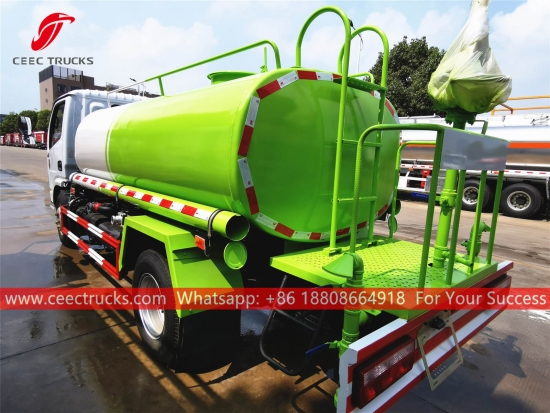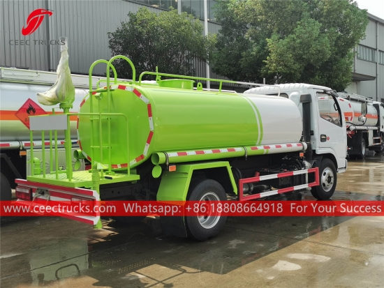 DONGFENG 5,000L給水車、DONGFENG 4x2左ハンドルシャーシ、5速マニュアルギアボックス、YUCHAI 115馬力ディーゼルエンジン、有名ブランドのウォーターポンプ、オプションでフロント、ミドル、リア散水ノズルを装備。塗装とロゴはご要望に応じて変更いたします。