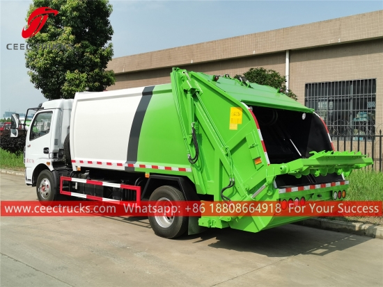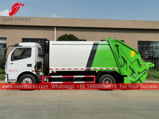東風6cbmゴミ圧縮車。シャーシにはYUCHAI製130馬力ディーゼルエンジンと5速トランスミッションを搭載。シーメンス製PLC制御ボックスにより操作が簡単。塗装とロゴはすべてお客様のご要望に応じて変更いたします。