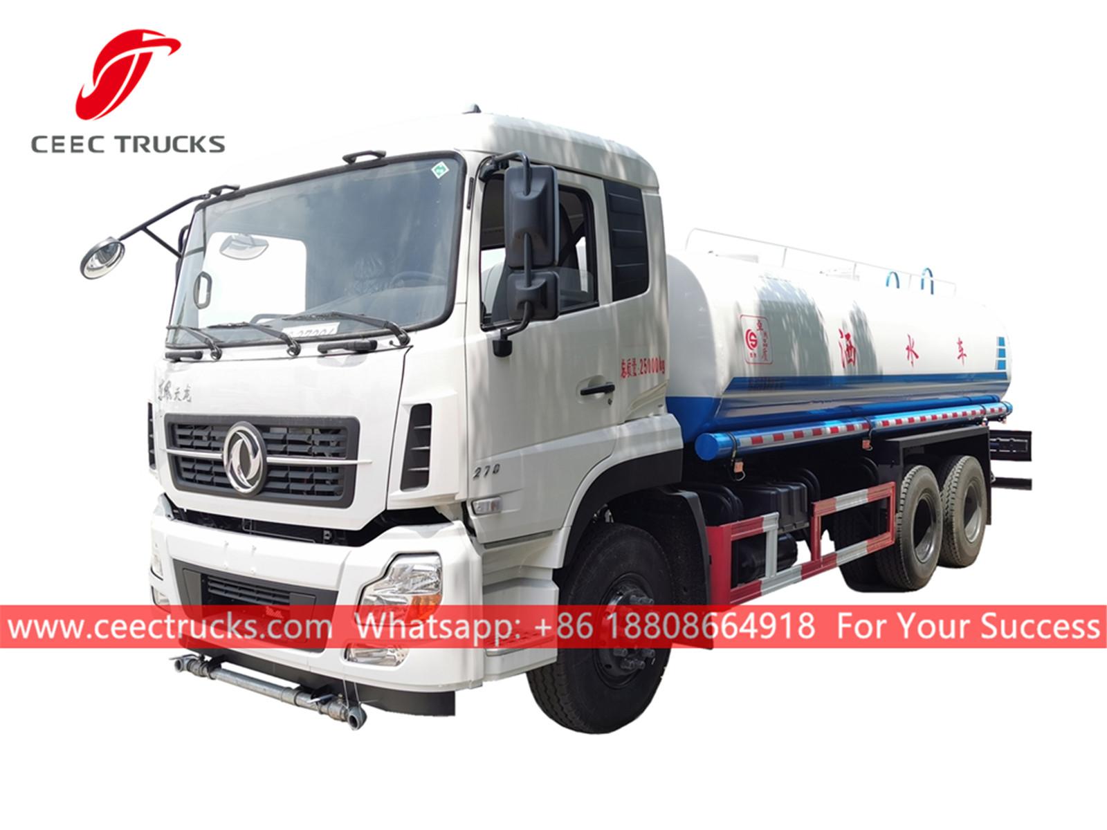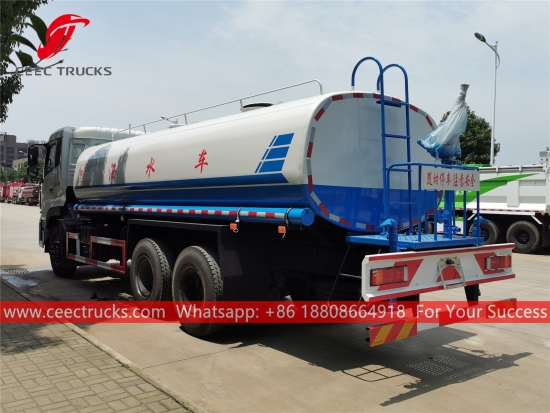 DONGFENG 15,000L 給水車、DONGFENG 6x4 左ハンドルシャーシ、8段マニュアルギアボックス、CUMMINS 270馬力ディーゼルエンジン、有名ブランドのウォーターポンプ、オプションでフロント、ミドル、リアの散水ノズルを装備。塗装とロゴはご要望に応じて変更いたします。
