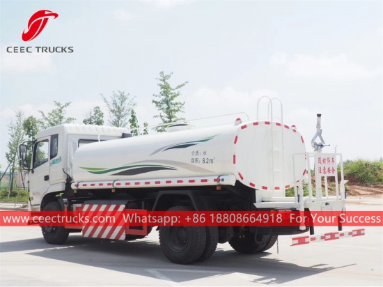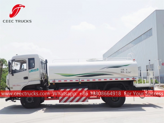 DONGFENG 8,000L散水車、DONGFENG 4x2左ハンドルシャーシ、6速マニュアルギアボックス、YUCHAI 160馬力ディーゼルエンジン、有名ブランドのウォーターポンプ、オプションでフロント、ミドル、リア散水ノズルを装備。塗装とロゴはご要望に応じて変更いたします。