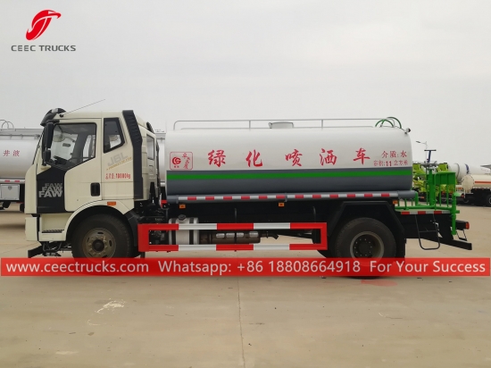 FAW 11,000L 給水車、FAW 4x2 左ハンドルシャーシ、6速マニュアルギアボックス、FAW 224馬力ディーゼルエンジン、有名ブランドのウォーターポンプ、オプションでフロント、ミドル、リアの散水ノズルを装備。塗装とロゴはご要望に応じて変更いたします。