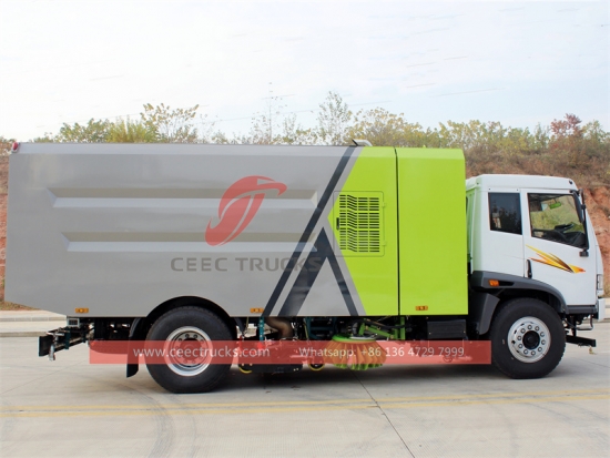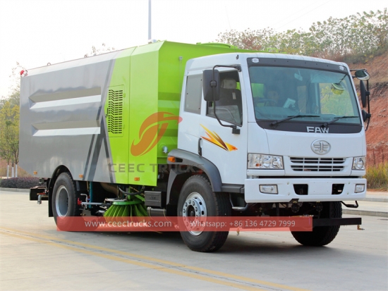 FAW 9+6cbmバキューム清掃トラック、FAW RHD 4x2シャーシ、6速マニュアルギアボックス、160馬力ディーゼルエンジン、ステンレス製ダストビンと浄水器、洗浄システム付き2ブラシシステム、キャビン電動コントロールで操作性向上。塗装とロゴはご要望に応じて変更いたします。