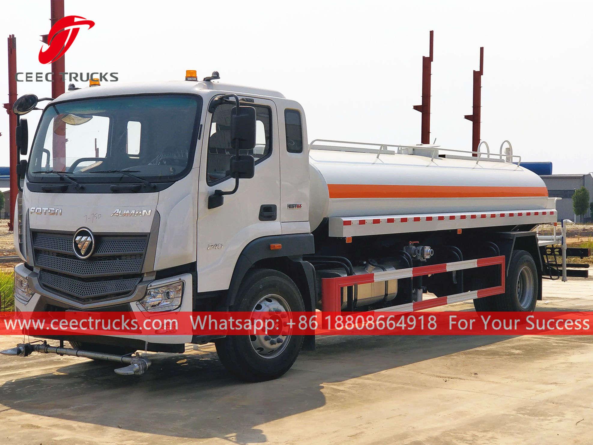 FOTON 10,000L散水トラック、FOTON 4x2左ハンドルシャーシ、6速マニュアルギアボックス、CUMMINS 210馬力ディーゼルエンジン、有名ブランドのウォーターポンプ、オプションでフロント、ミドル、リア散水ノズルを装備。塗装とロゴはご要望に応じて変更いたします。