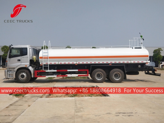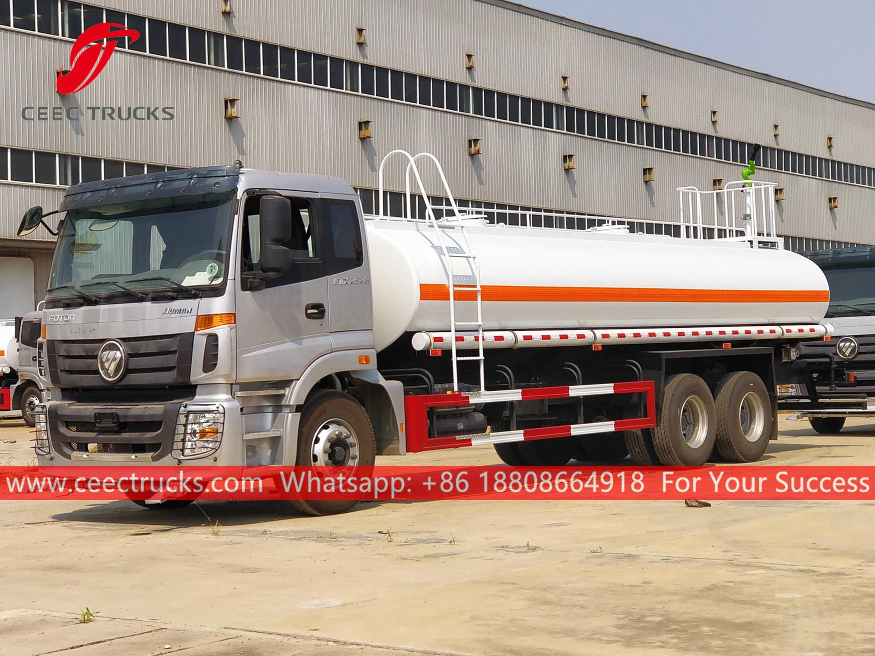 FOTON 15,000L給水車、FOTON 6x4左ハンドルシャーシ、8段マニュアルギアボックス、CUMMINS 270馬力ディーゼルエンジン、有名ブランドのウォーターポンプ、オプションでフロント、ミドル、リアの散水ノズルを装備。塗装とロゴはご要望に応じて変更いたします。