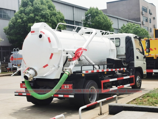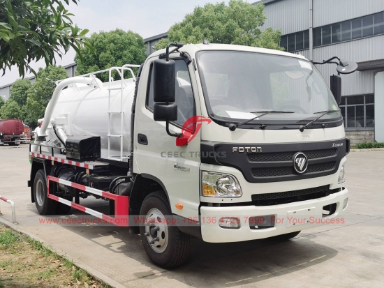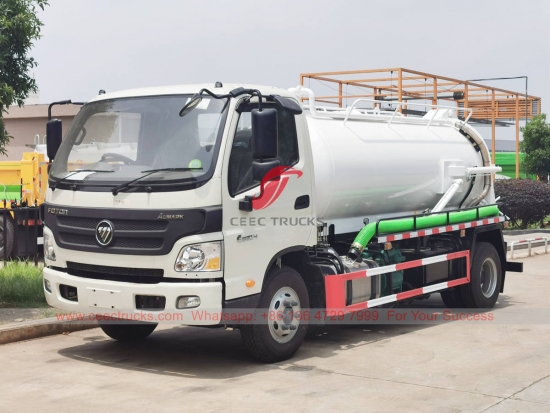 FOTON 4,000 リットル真空タンク車、FOTON 4x2 右ハンドル シャーシ、6 シフト マニュアル ギアボックス、CUMMINS 141HP ディーゼル エンジン、強力な真空タンク、有名ブランドの真空ポンプ、すべての塗装とロゴは要件によって異なります。