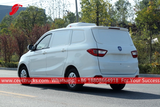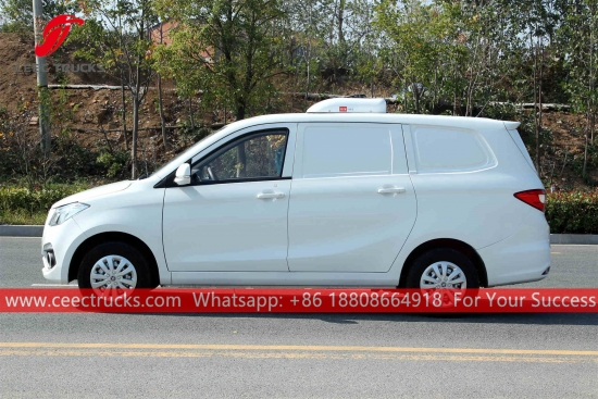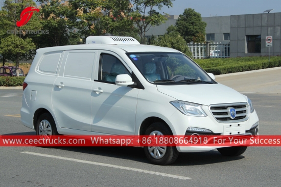 FOTONミニ冷蔵トラック、CEECガラス繊維強化プラスチック素材、断熱層の厚さは8mm以上。高性能を実現するアメリカキャリア標準の冷却ユニット。FOTON LHDシャーシ、115馬力エンジン、5速マニュアルギアボックス。