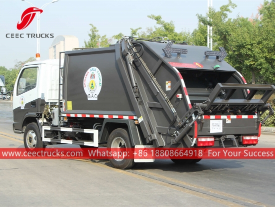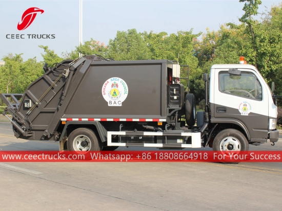 ガンビアの東風6cbmゴミ圧縮トラック。シャーシにはYUCHAI製115馬力ディーゼルエンジンと5速マニュアルトランスミッションを搭載。CAN-BUS制御システムで操作も簡単。塗装とロゴはすべてお客様のご要望に応じて変更いたします。
