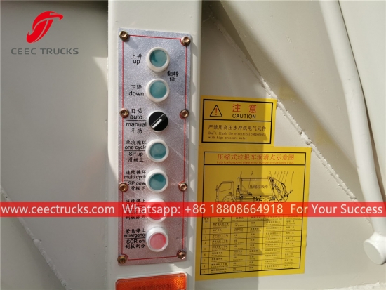 新設計の 8,000 リットル リアローダー ゴミ収集車本体は、高強度鋼材の圧縮機本体、輸入制御 PLC モデル、油圧シリンダー制御装置、英語版制御ボックスを採用しており、操作が簡単です。
