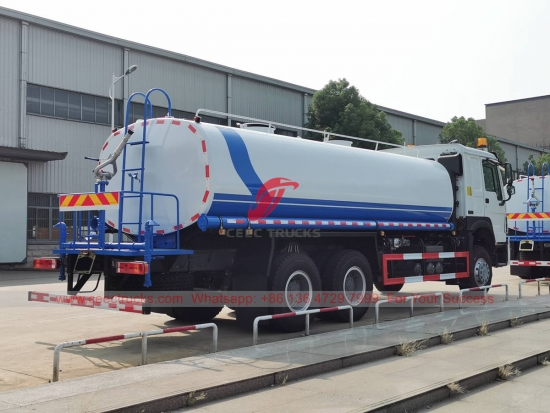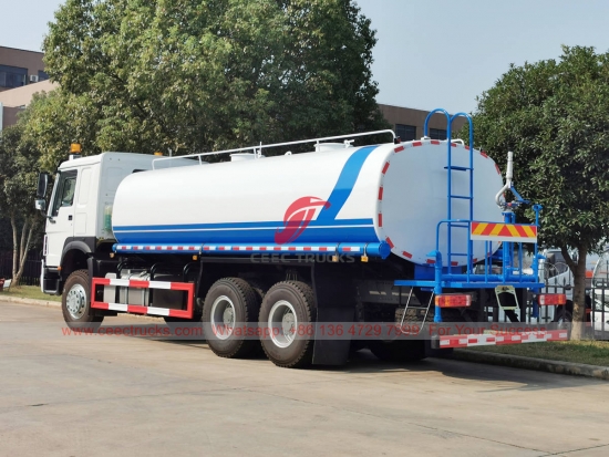 HOWO 20,000L散水トラック、HOWO 6x4シャーシ、10段マニュアルギアボックス、WEICHAI 336馬力ディーゼルエンジン、有名ブランドのウォーターポンプ、オプションでフロント、ミドル、リア散水ノズルを装備可能。塗装とロゴはご要望に応じて変更いたします。