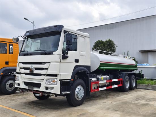 HOWO HW76, NX cabin is optionalHOWO 6×4散水車は、SINOTRUK HOWO ZZ1257 6×4駆動シャーシを改造した多機能グリーン衛生車両です。20,000Lの炭素鋼製水タンク、80QZ60/90型散水ポンプ、スプリンクラーシステムを搭載しています。搭載ポンプで外部水源から水を汲み上げ、加圧送水することで、前方・後方・側面のスプリンクラーと射程距離35メートル以上の放水砲に散水し、多様な散水モードを実現します。
