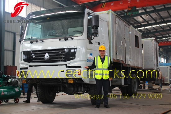 HOWOオフロードモバイルメンテナンスワークショップは、SINOTRUK HOWO 4 * 4軍用シャーシを使用し、Weichai WP10.290エンジン、FAST 9シフトマニュアルギアボックス、ドイツのMANテクノロジーアクスルを搭載し、重量輸送に対応しています。