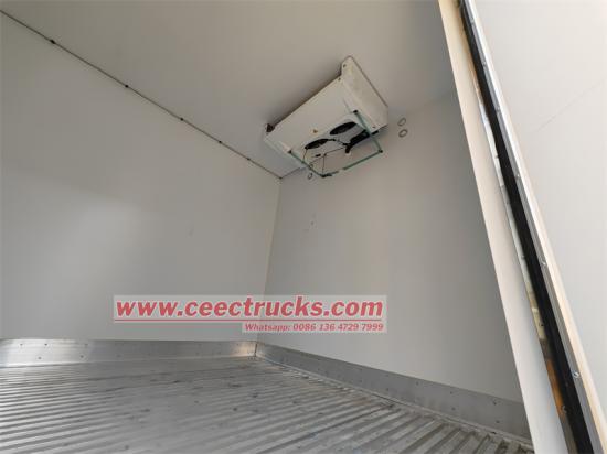 HOWO 4x2冷蔵トラック、HOWO Leaderシリーズの軽トラックシャーシを改造、ホイールベース3360mm、Weichai WP3NQ160E61 160馬力エンジン、Xingrui ML650A 6速ギアボックス、上部冷蔵ボックスボディ4100×2300×2050mm サイズ、グラスファイバー素材、FRP + PU フォーム + FRP 105 mm パネル素材、完全に密閉されたサンドイッチ パネル、右側ドア、フルサイズのダブル リア ドア、滑り止めおよび耐摩耗性の床、キャリア CITIMAX D6 非独立型冷凍ユニット。