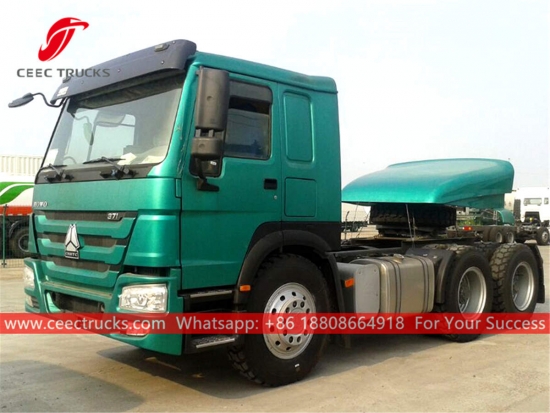 SINOTRUK HOWO 6x4 トラクター ヘッド、SINOTRUK 371HP ディーゼル エンジン、10 シフト マニュアル ギアボックス、最大牽引重量は 40,000kg まで可能、塗装およびロゴは要件に応じて異なります。